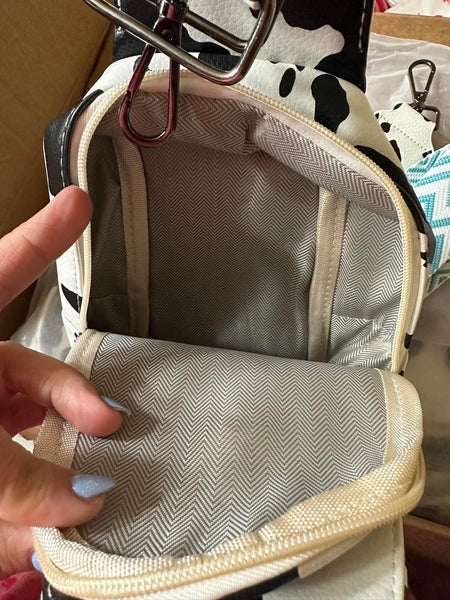 🖤 Cow print leather🖤 2 sections 🖤 Adorable removable turquoise colored Aztec crossbody strap 🖤 Front pocket for phone, keys and cards with easy access button closure 🖤 Large main pocket with zipper closure for everything else!!